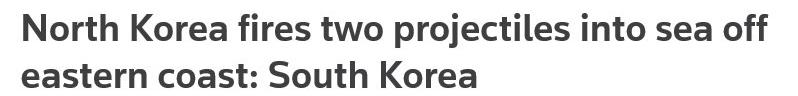 【韩国:朝鲜向东海岸发射两枚不明飞行器】韩国军方表示,朝鲜周六向其东海岸海域发射了两枚不明飞行器。