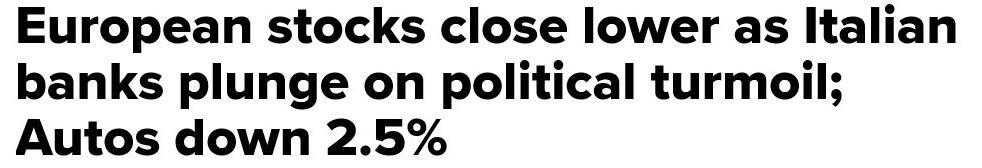 因投资者担心政局动荡加剧纷纷撤离意大利资产,意大利富时MIB指数收盘时下跌2.5%,其银行股暴跌,Banco BPM股价下跌9%,联合信贷银行 (Unicredit) 和Ubi Banca分别下跌5%和8%。