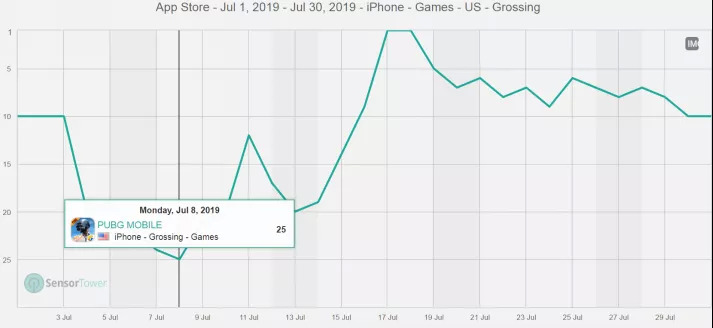 7月《PUBG Mobile》美国iOS畅销排行趋势