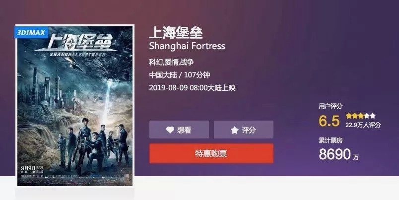至少上映第二天,《上海堡垒》票房才勉强过亿。猫眼看电影上的打分才 6.5 分,通常一些口碑较差的商业片在猫眼看电影的评分都在 8 分以上。