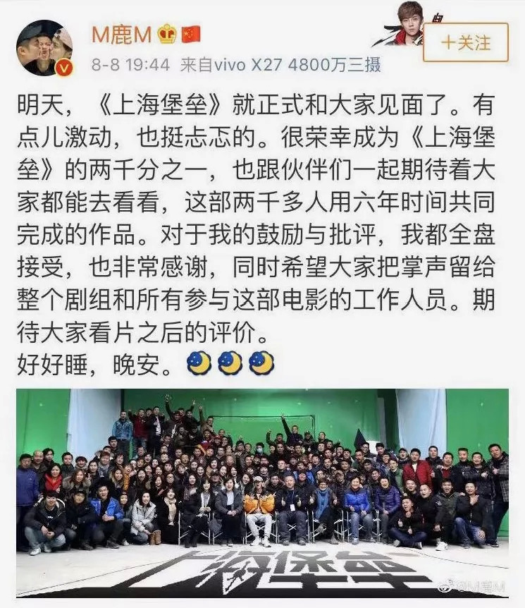 我并不是想黑鹿晗,也不是针对他(鹿晗作为小鲜肉的标杆人物,今年已近 30 岁)。事实鹿晗也是个明白人,影片上映时他发的微博就比较低调,声言自已只是该片 2000 个工作人员之一,对于鼓励和批评,他将全盘接受。做为小鲜肉他有他存在的价值,演技有限的他可能并没有错,错的是对他抱以高票房期望的导演和出品方。