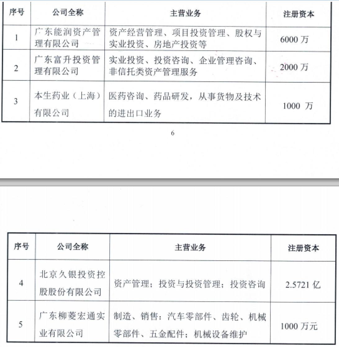 公开信息显示,张能勇旗下主要有5家公司,除了上述持股80%的广东能润外,还有持股55%的广东富升投资管理有限公司(下称广东富升)、持股18%的本生药业(上海)有限公司,以及有广东富升持股14.6%的北京久银投资控股股份有限公司、持股100%的广东柳菱宏通实业有限公司。
