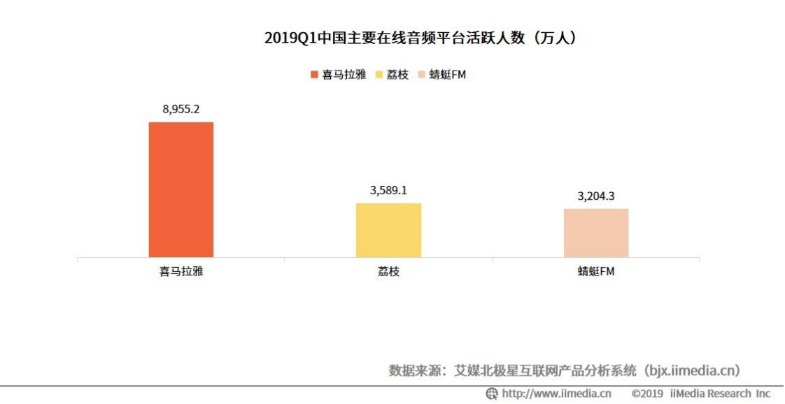 多年耕耘市场之后,三强都拥有了大量忠实用户,除了喜马拉雅较为领先,荔枝和蜻蜓FM一直在伯仲之间,尤其在活跃用户方面两家的差距并不明显。通过iiMedia Research(艾媒咨询)最新的调研可以发现,2019年第一季度这三家主流在线音频平台的活跃人数分别达到8955.2万人、3589.1万人和3204.3万人。