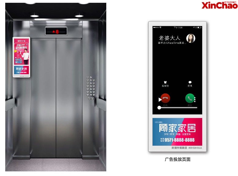 电梯广告还可以做成H5小游戏、直播视频类型的效果,激发更生活化的互动和社交。譬如顾家家居的电梯视频广告,会让你感觉在“接电话”:一个模拟苹果手机来电的场景作为开头,还能带给你一种对话感,虽然广告里的人物喊出的是促销信息。