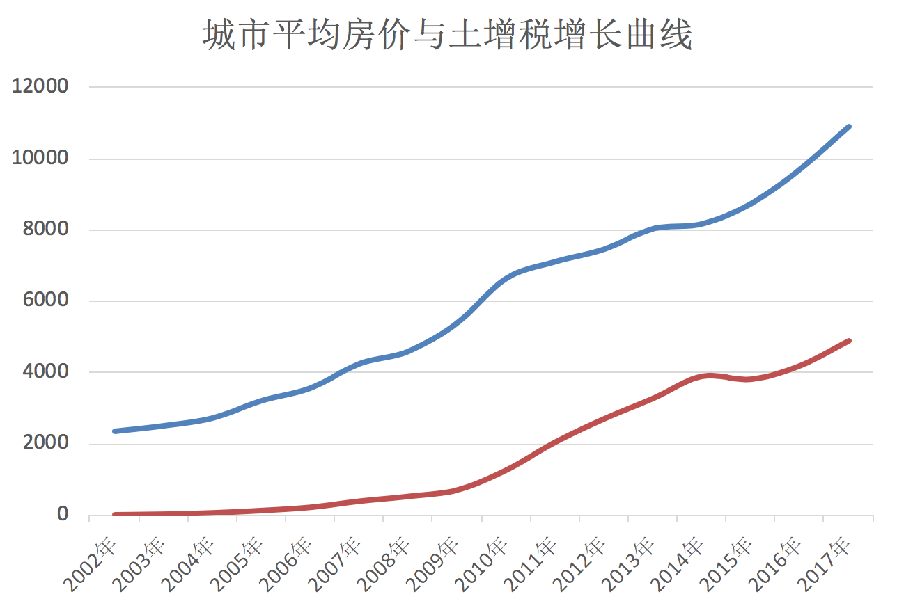 据国家统计局公布的全国主要城市房产价格数据,从2009年开始,土地增值税收入快速增加,从2008年的719.57亿元增长到1278.31亿元,增幅达78%。到2017年,全国土地增值税收入达到4911.3亿元,比2008年增长了近6倍。再看作为调控对象的房价,众所周知,全国城市房价在近10年呈高速上涨趋势。从2008年至2017年,北京、上海、广州和深圳的平均房价分别上涨了1.6倍、1.9倍、0.9倍和2.8倍。笔者比较了2008年至2017年土地增值税收入和全国主要城市平均房价的走势,发现两者的增长曲线基本一致,土地增值税与房价的上升完全是正相关关系(见下图)。由此可以看出,征收土地增值税对于城市房价上涨没有抑制作用。