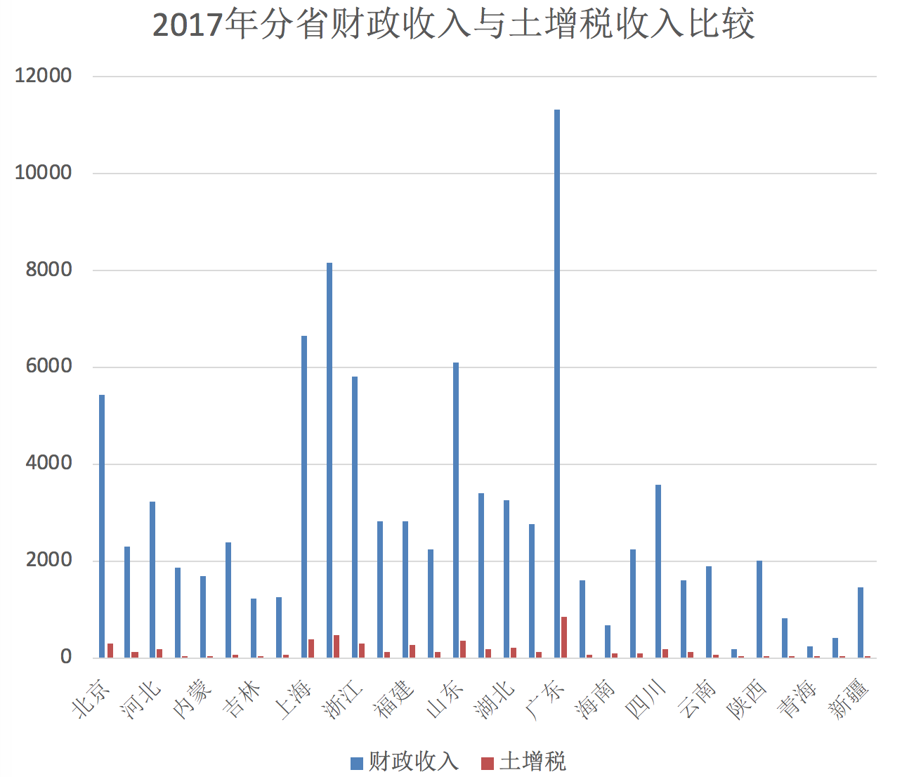 一般来说,经济越发达的地区,土地增值幅度和房地产交易量就会越大,因此地方政府的土地增值税收入在富裕地区和非富裕地区的存在较大差异。2017年全国地方财政收入排列前6位的省市的土地增值税收入达2630.84亿元,占这项税收全国总收入的53.57%。全国31个省级地区,财政收入越富裕则土地增值税收入越高,财政收入越低的地区土地增值税收入越低,土地增值税对于地方财政贡献的边际效应递减。