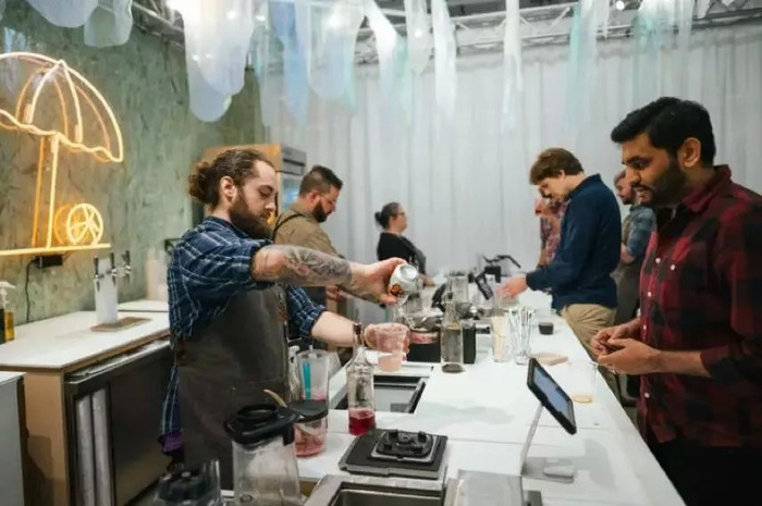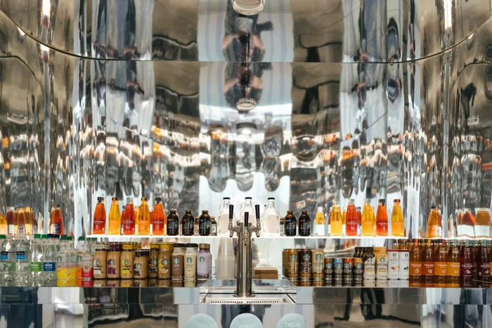 我们先来到一个叫做“Cold Pop”的冷饮吧台,约翰逊称之为“冷饮创新”,一个大胡子的小哥正拿着透明的雪克杯,专注手摇一杯红色的饮品,吧台前还有三三两两的顾客在喝东西。