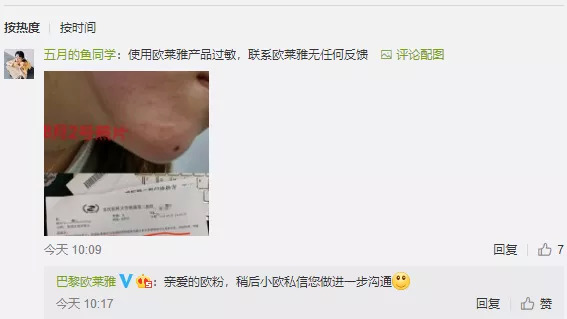 今天(8月9日)上午10点,巴黎欧莱雅在其官博发布一条微博后不久,昵称为“五月的鱼同学”的网友便在该微博下方评论称“使用欧莱雅产品过敏,联系欧莱雅无任何反馈”,并配上一张图片。8分钟后,巴黎欧莱雅官博客服回复称将私信该网友做进一步沟通。