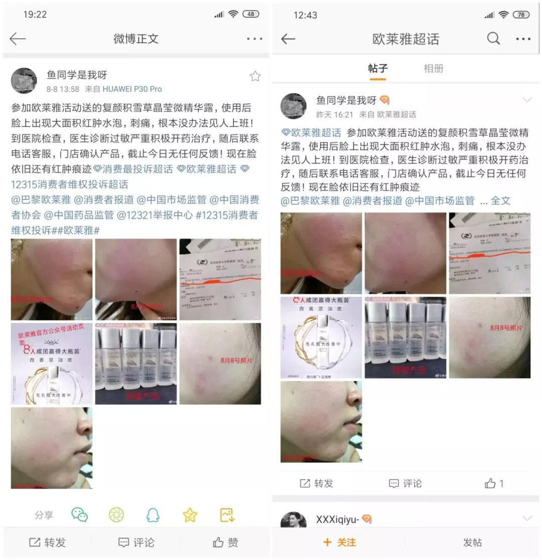 “鱼同学是我呀”的网友称其电话联系了欧莱雅客服,门店确认产品,但“截止今日无任何反馈!现在脸依旧还有红肿痕迹”。并手动@巴黎欧莱雅、 消费者报道、中国市场监管、中国消费者协会、12321举报中心;发布7张相关照片。随后,该网友还在欧莱雅超话发布了内容相同的帖子。