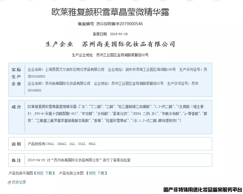 据了解,本次涉事的欧莱雅复颜积雪草晶莹微精华露是今年4月推出的新产品,歌手李宇春还为该产品拍摄代言广告片。在欧莱雅官方旗舰店,该产品的实际售价为309元/瓶(240ml)。据欧莱雅官方介绍显示,欧莱雅复颜积雪草晶莹微精华露产品蕴含专利焕肤黑科技,含有欧莱雅专利LHA辛酰水杨酸与欧莱雅专利新生代酵素活化剂H.E.P.E.S。