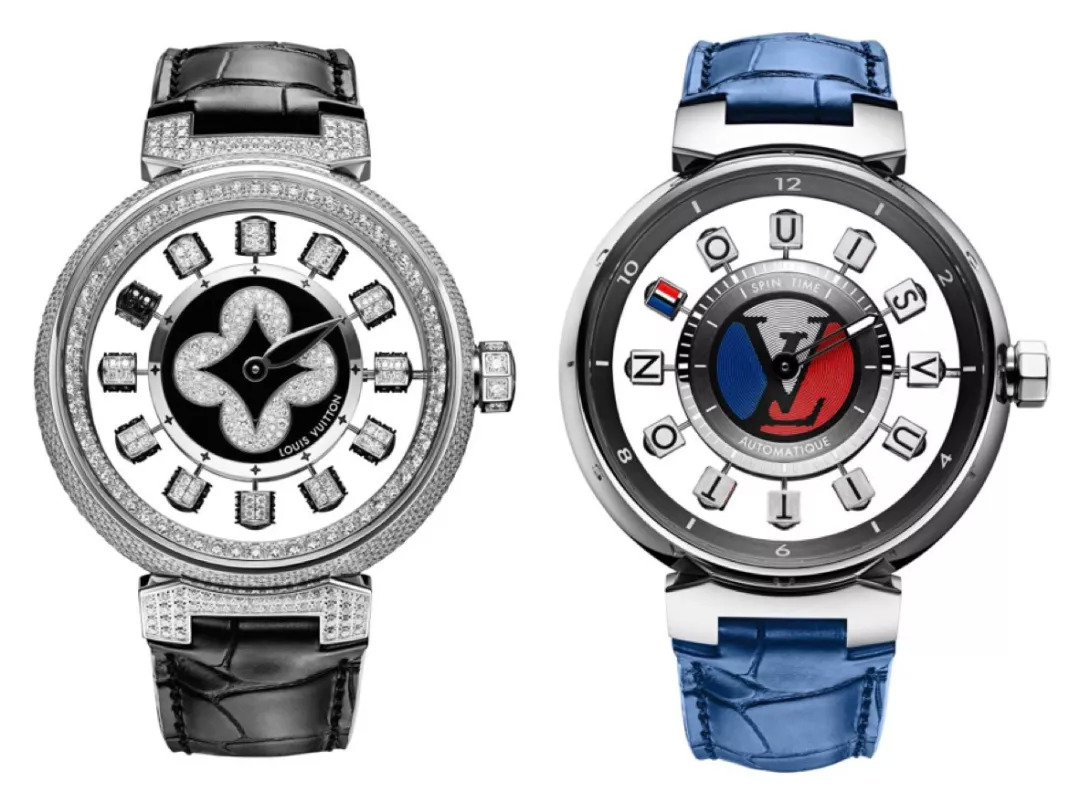 这个三维旋转显示时间是LV十年前推出的设计,那时叫Tambour Spin Time,今年全新表款在后面添加了Air,指机芯经过重新设计,立体时标位置镂空、前后衬以透明蓝宝石,看起来像悬浮在空中一样。