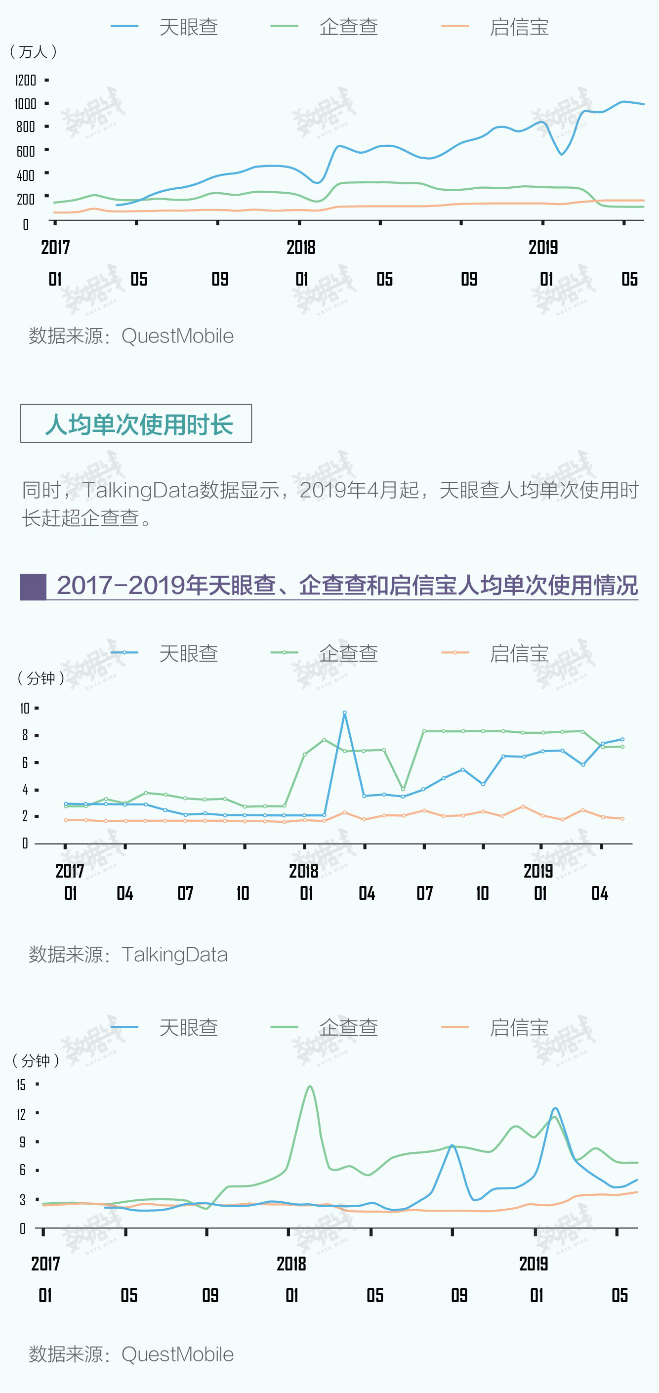 天眼查、企查查和启信宝间的竞争再次升级。8月7日,天眼查获得ACM SIGKDD(国际数据挖掘与知识发现大会,简称 KDD)创业研究奖。据TalkingData和QuestMobile数据,2017年1月以来,企查查月活跃用户逐渐被天眼查、启信宝反超。从“知识产权”、“用户争夺”到“资本博弈”,究竟谁才是行业老大?