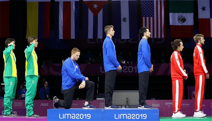 当地时间8月10日,美国男子击剑队在秘鲁首都利马举行的泛美运动会上赢得金牌。在升国旗奏国歌的环节,美国队成员伊博登 (Race Imboden) 突然单膝跪地。他的队友Gerek Meinhardt和Nick Itkin并未效仿,而是继续站着。