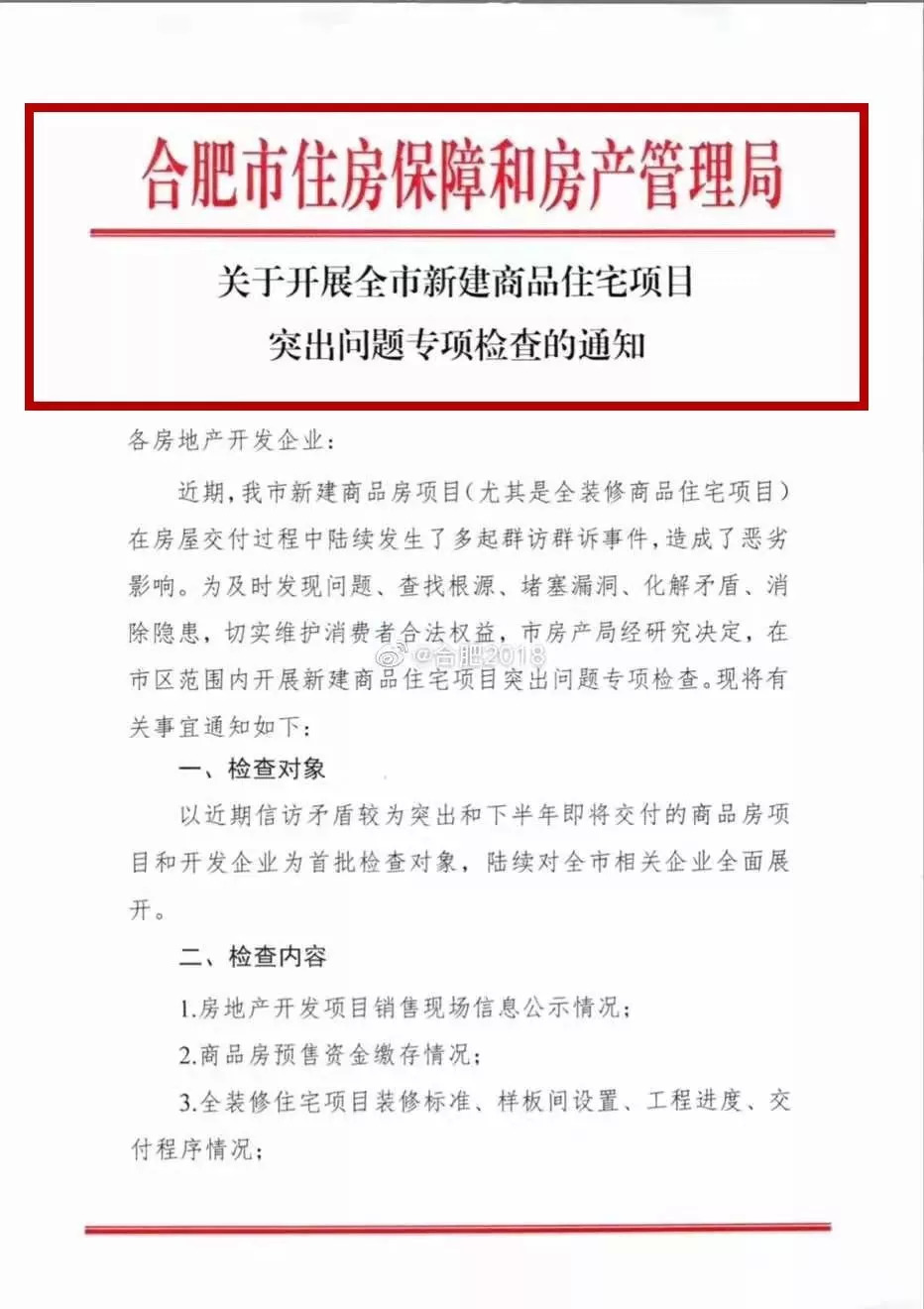 近日,合肥房管局再出手!针对市场上不断发生的维权事件,合肥市住房保障和房产管理局发布对开发商发出了红头文件《关于开展全市新建商品住宅项目突出问题专项检查的通知》!
