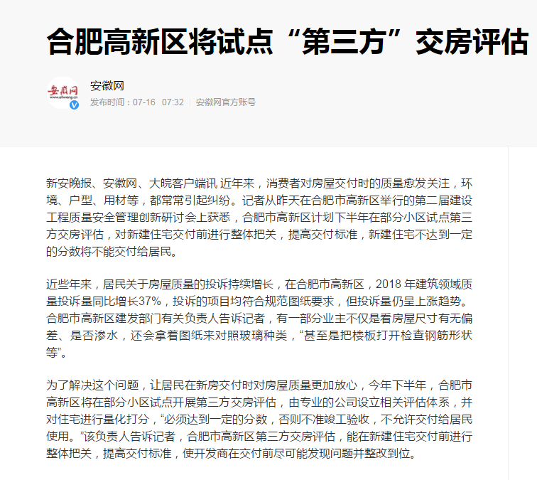 此外,合肥高新区将率先开展第三方交房评估!