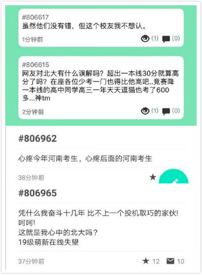 但先退档再进行补录的过程,也导致了一定争议。在补录的决定被公布后,引发了北大校内匿名平台“树洞”的讨论。