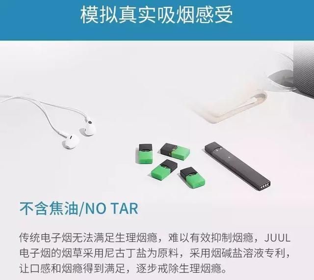 JUUL采用类似口香糖的扁平方形设计。烟弹和烟杆分体设计,JUUL采用尼古丁盐为原料,采用盐碱盐溶液专利,让口感和烟瘾得到满足。
