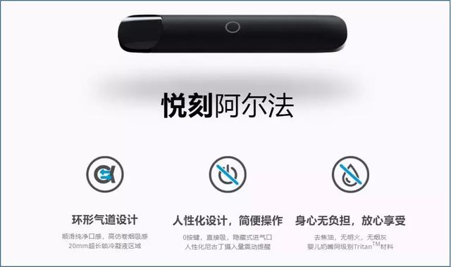 悦刻的成功源于对产品的设计研发的重视,和对用户体验关注。悦刻阿尔法,是官网上最贵的一款产品,采用了环形气道设计,有着高仿卷烟的吸感;而操作则极为简单,实现0按键直接吸,材料使用了与婴儿奶嘴同级别的Tritan材料。全部设计既照顾到卷烟用户的体验,又有独特的创新。