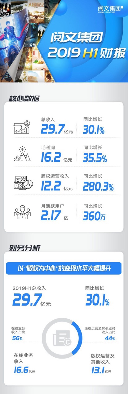 阅文公布2019半年报:营收同比增长30.1%,版权收入增长280.3%