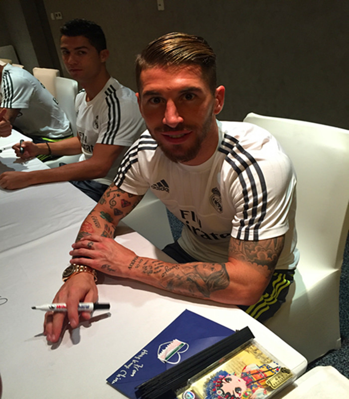 在签名会现场,阿韦罗亚领头,佩佩收尾,皇马众星围长桌而坐,耐心地为大约70名赞助商指定的球迷签名并配合球迷留影。“我刚好签到拉莫斯那儿,我用英语请求他留在队中,他右眼对我眨了一下,还与我握了手,不知道是不是肯定回答。”一名球迷拿着皇马全队的签名足球对界面新闻记者激动的描述。