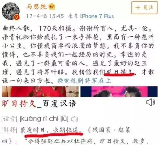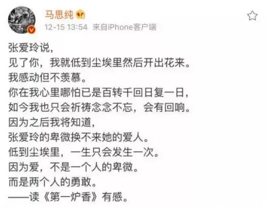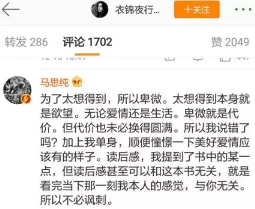 去年年底,马思纯在阅读完原著之后,在微博写下了自己的阅读心得。