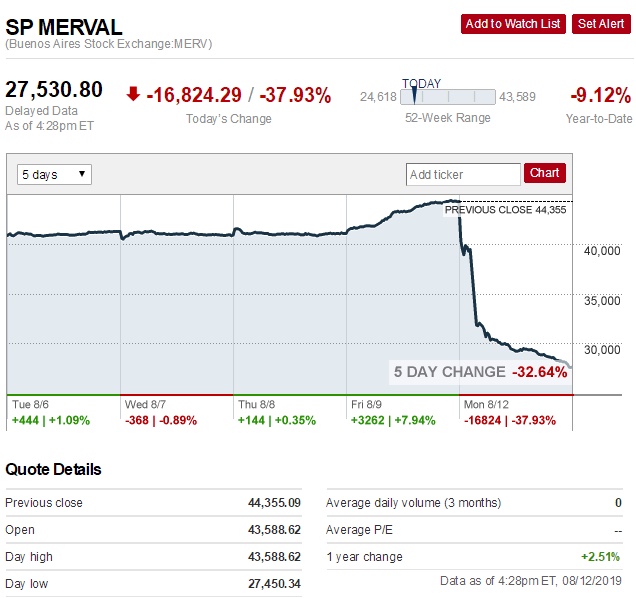 综合考虑汇率和股市自身波动后的结果令人咂舌。据报道,周一,美元计价的阿根廷S&P Merval指数暴跌48%,为在统计的全球94个主要股票指数中自1950年以来第二大单日跌幅。