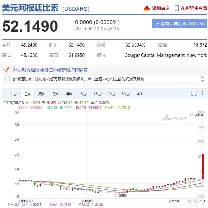 同样走势夸张的还有该国货币。周一,阿根廷比索兑美元汇率最低跌至62比索兑1美元,较前值(45.25比索兑1美元)跌幅高达37%。