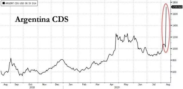 此外,信用违约掉期(CDS)的数据显示,阿根廷在未来五年发生债务违约的可能性当前为72%,明显高出上周五(8月9日)的49%,这一衡量债券风险的五年期信用违约掉期一天内激增逾800个基点。2017年发行的阿根廷100年期“世纪债券”价格跌27%,至54.66美分。