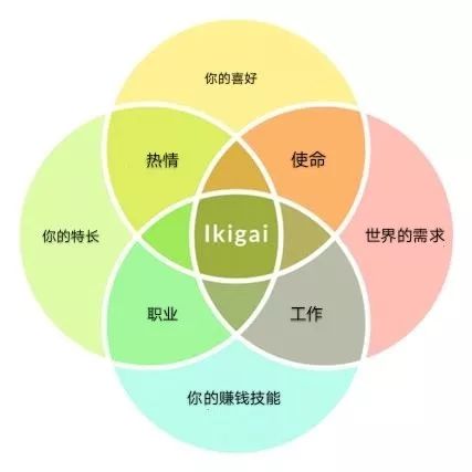 对于更大层面的职业转型规划,一个能够发掘多种可能性的框架将是有用的。一位咖啡约见人向奥洛夫介绍了ikigai(生命的意义)模型,它能帮你找到会带来个人职业满足感的东西。在ikigai图中,能够赋予你目标和激情的角色,将位于四个优先领域的中心。