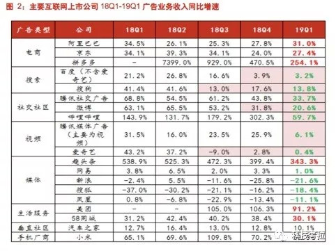 不幸的是,作为百度供养创新业务的输血器,搜索业务的变现增长空间在不断下降。东方证券整理的一个图表显示,从2018年一季度到2019年一季度,百度和搜狗的广告收入同比增速几乎在持续下降。