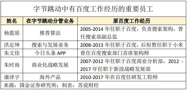 2014年,原百度网页搜索部技术副总监杨震原被张一鸣挖走,现任字节跳动副总裁,是字节跳动1-14-106架构中的14位高管之一。2018年,李成刚、康泽宇违反竞业协议,一边拿着百度发的竞业限制补偿金,一边又加入头条泄露商业秘密,最终被百度诉于法庭,百度胜诉,两人被判处退还竞业补偿金并支付违约金共计166万余元。
