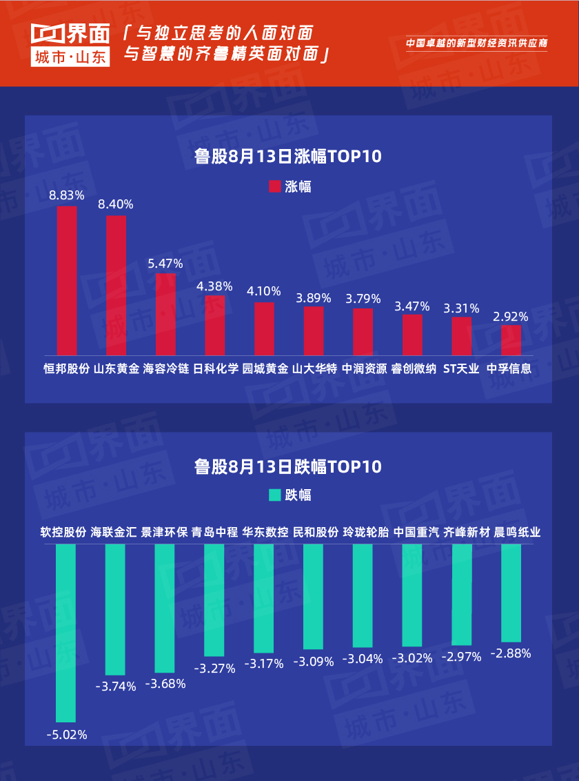 8月13日鲁股总结:43只个股上涨,恒邦股份涨幅山东最高