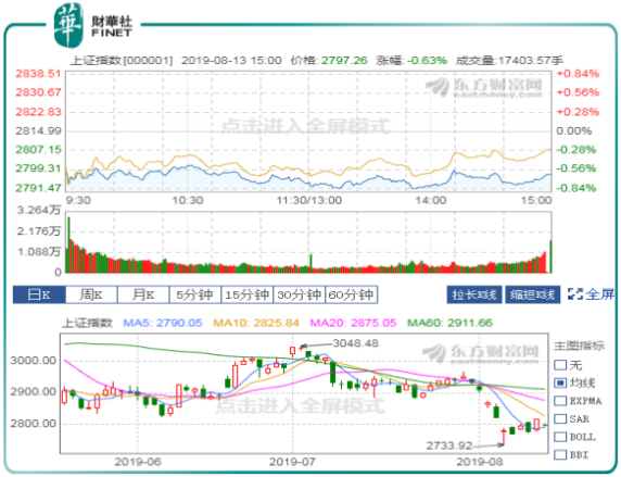 8月13日,受国际资本市场下跌的消息影响,今日沪深三大股指集体低开,开盘之后指数一度震荡上行,盘中氟化工、军工表现活跃,随后有色板块持续拉升,机场航运板块逆市上涨,但始终未能形成合力带动两市企稳上行,随后再度回落持续震荡。午后,市场避险情绪急剧升温,黄金等避险类资产大涨,沪指失守2800点后围绕年线附近低位盘整,深成指也跌幅近1%,创业板指收跌1%,上证50跌超1%,个股跌多涨少,题材概念再度萎靡,成交量持续低迷。
