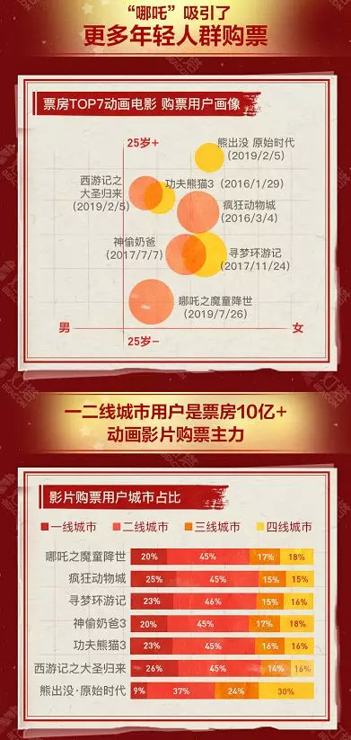 把《哪吒》和过往的高票房动画电影对比来看,可以看出在《哪吒》刚刚创下动画电影的票房纪录时,灯塔研究院发布的数据图显示,一二线城市的年轻女性成为影片购票的主力。