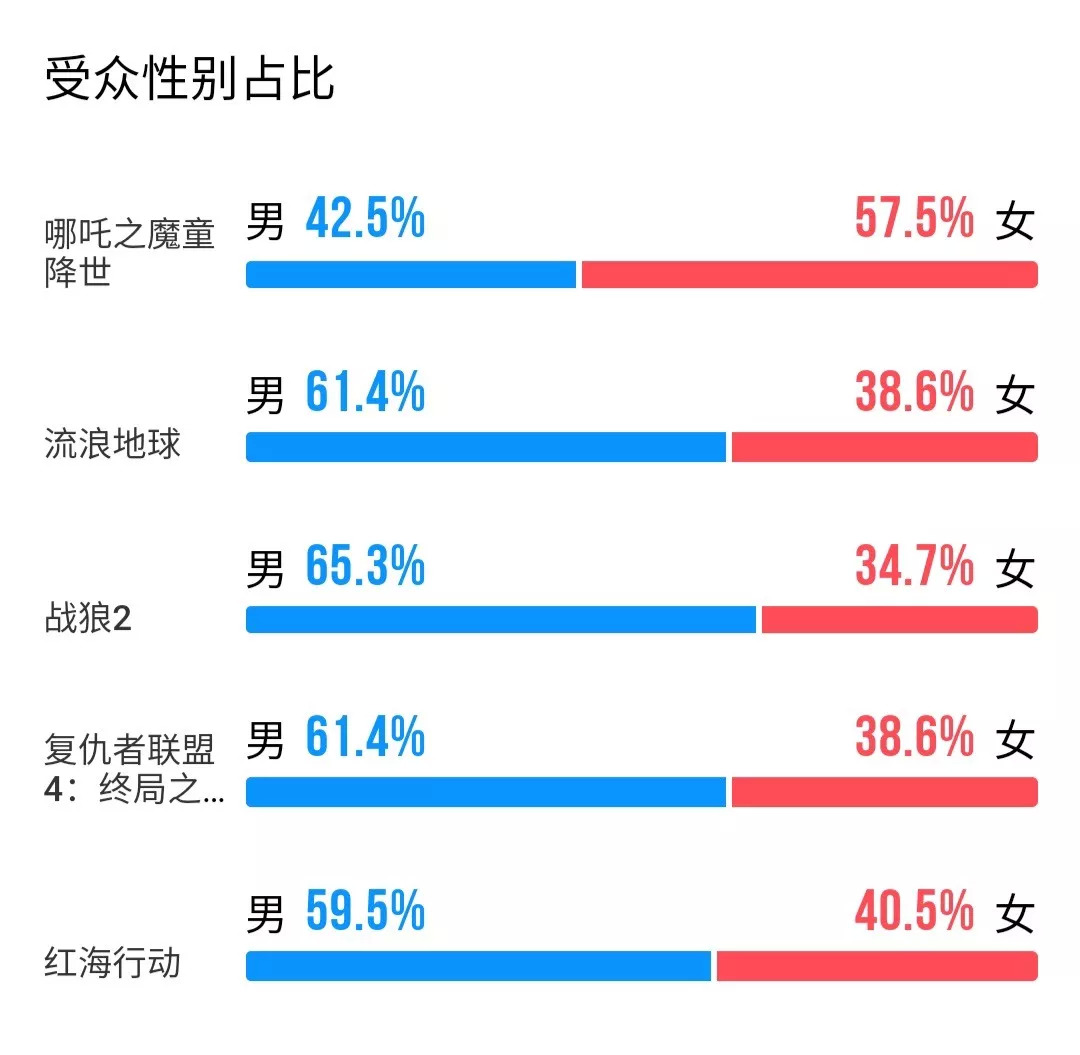 而如果对比超过35亿的电影,《哪吒》也是其中唯一非“直男向”的影片——在灯塔专业版上,虽然票房过35亿的几部影片的观众城市和职业分布没有大的区别,但是无论是《战狼2》、《流浪地球》还是《红海行动》,男性观众都成为了电影票房绝对的主力,《哪吒》则是女性观众占比较多,百分比达到了57.5%,远超其他几部影片。
