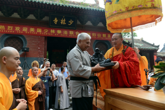 2013年7月3日,河南嵩山,少林寺再度迎来美国少林拳法联盟250余名习武弟子。图为释永信送给洋弟子一尊释迦穆尼佛像。