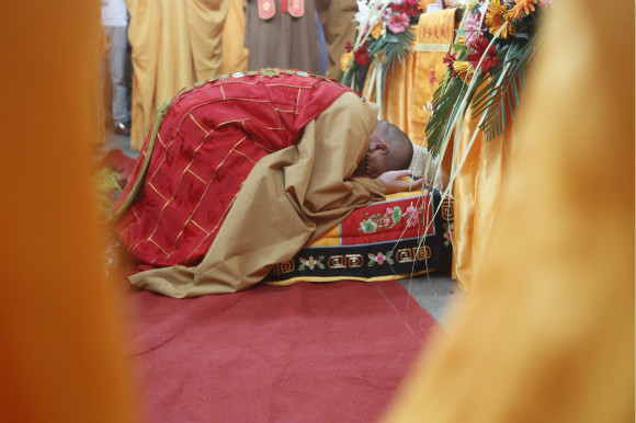 2014年5月31日至6月1日,第四届中国佛医高峰论坛在河南登封少林寺举行,此次活动以弘扬少林佛医文化、促进佛医产业开发为宗旨。图为开幕式上释永信在礼佛唱诵。