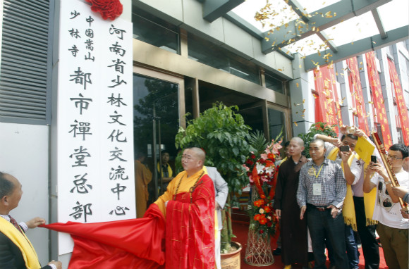 2014年09月20日,郑州,释永信在都市禅堂揭牌仪式上揭牌。