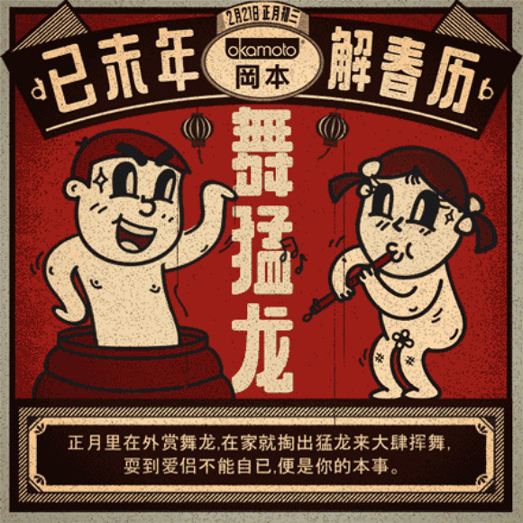 Adweek称这可能是历史上第一个劝你别那么兴奋的安全套广告,但其实冈本在中国其实早就已经放弃性感走KUSO风了。今年新春,冈本中国发布了一组名为“解春历”的Gif广告,是一个小男孩和一个小女孩的漫画动图,“舞猛龙”、“开门炮”等春联配着“胸罩不去,凶兆肯定不走”的解说词,真是太有内涵,不过看完之后也是逗乐为主,一点也不性感。
