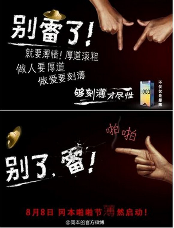 Buzzfeed曾总结出世界最好的十大安全套广告,其中有一半都来自杜蕾斯。无论是杜蕾斯和冈本,在中国由于社会环境和广告费用的关系,都不约而同地转向社会化营销。