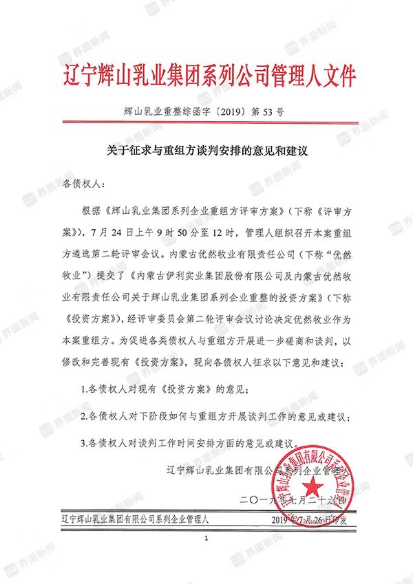 界面新闻独家获得的文件显示,一份由“辽宁辉山乳业集团系列公司管理人”在7月26日下发的文件称,根据《辉山乳业集团系列企业重组方评审方案》,7月24日管理人组织召开本案重组方遴选第二轮评审会议,内蒙古优然牧业有限公司提交了《内蒙古伊利实业集团股份有限公司及内蒙古优然牧业有限责任公司关于辉山乳业集团系列企业重整的投资方案》(下称“投资方案”)。经评审委员会第二轮评审会议讨论决定优然牧业作为本案重组方,并开始向债权人征求意见,以修改和完善《投资方案》。