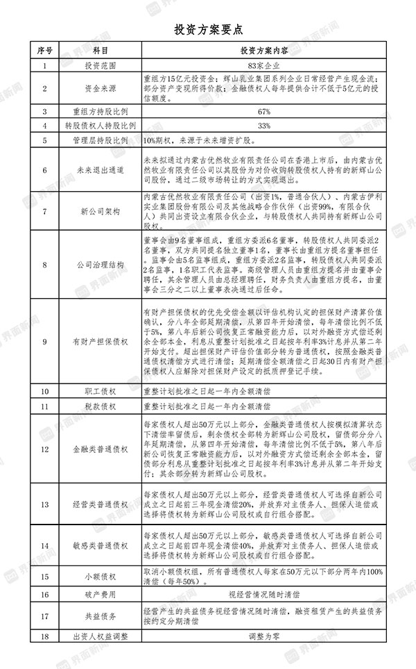 界面新闻独家获得的《投资方案》要点包含,伊利作为重组方,拟投资15亿获得新辉山公司67%的股权。