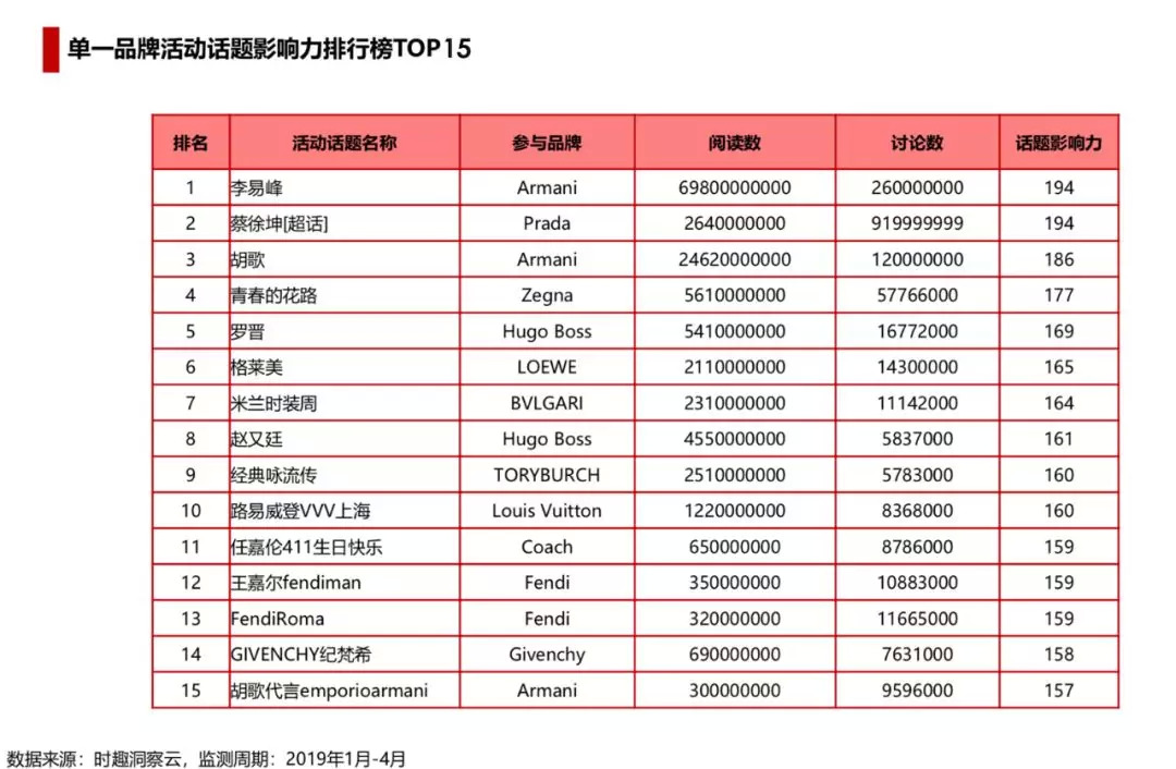 本土流量明星对奢侈品品牌热度的带动作用是显而易见的,根据时趣洞察云的大数据分析,今年1-4月中,李易峰、蔡徐坤、赵又廷等流量明星话题对奢侈品品牌影响力的促进作用,明显大于时装周、电影节、展览活动等活动营销动作。