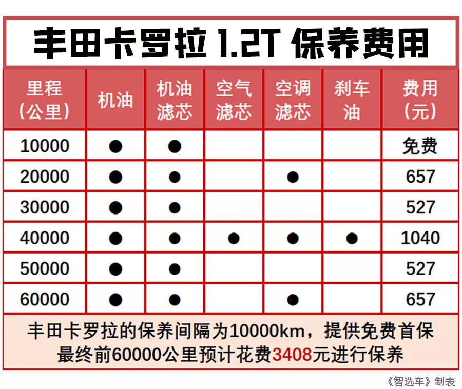 丰田卡罗拉的保养间隔长达10000公里,尽管每次保养都需要使用全合成机油,但是前6万公里总的保养费用仅为3408元。值得一提的是,丰田卡罗拉的汽油滤芯采用终身免维护设计,而变速箱油和火花塞的更换周期都长达8万公里。这在一定程度上降低了丰田卡罗拉前6万公里的保养费用。