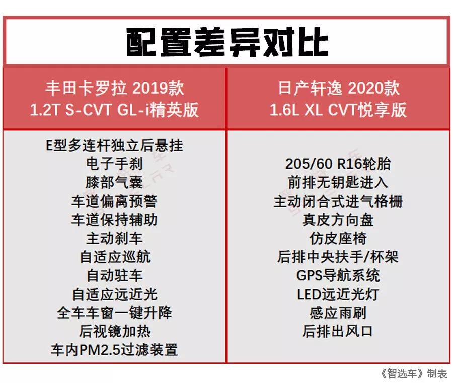 由于月薪只有3000元,所以在车型的选择上必须锱铢必较。配置当然越多越好,但是性价比也是必须考虑进去的因素。再三比较下,小智帮大家选择了指导价12.78万元的丰田卡罗拉2019款1.2T S-CVT GL-i精英版和指导价12.99万元的日产轩逸2020款 1.6L XL CVT悦享版。这两款配置都是各自车系中的高性价比版本,下面小智简单罗列了这两款车的配置差异。