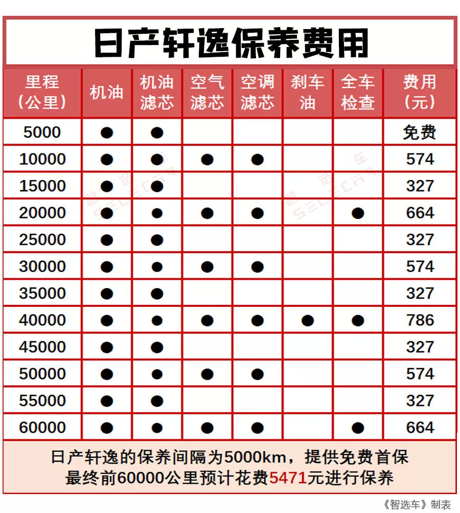 日产轩逸的保养间隔较短,不过每次小保养的费用更低,最终前6万公里预计花费5471元进行保养。日产轩逸的变速箱油、火花塞的更换周期为10万公里,所以前6万公里内并没有体现。不过对于用车比较频繁的消费者来说,5000公里的保养间隔实在太短,经常跑4S店也会浪费不少时间。