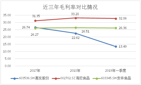 环球网记者注意到,这3家可对比公司中,海欣食品毛利率最高,自2017年-2019年一季度,毛利率分别为31.35%、33.28%、32.86%;安井食品近三年毛利率均保持在26%;而惠发股份毛利率则逐年呈现下滑趋势,2019年一季度毛利率下滑至13.49%。