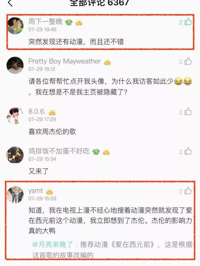 所以《爱在西元前》漫画能更新到119话,收获64.4亿热度,稳定在爱奇艺漫画人气排行榜Top6;《爱在西元前》动画从第3集开始,观众在评论和弹幕里留下的内容就从周杰伦和周杰伦的歌回归到了动画人物角色和故事的探讨;《爱在西元前》这首歌的评论里,也新增了看了动漫再去听歌的10后,00后……这些平台所覆盖的受众,既有歌迷,也有动漫爱好者和三次元受众。
