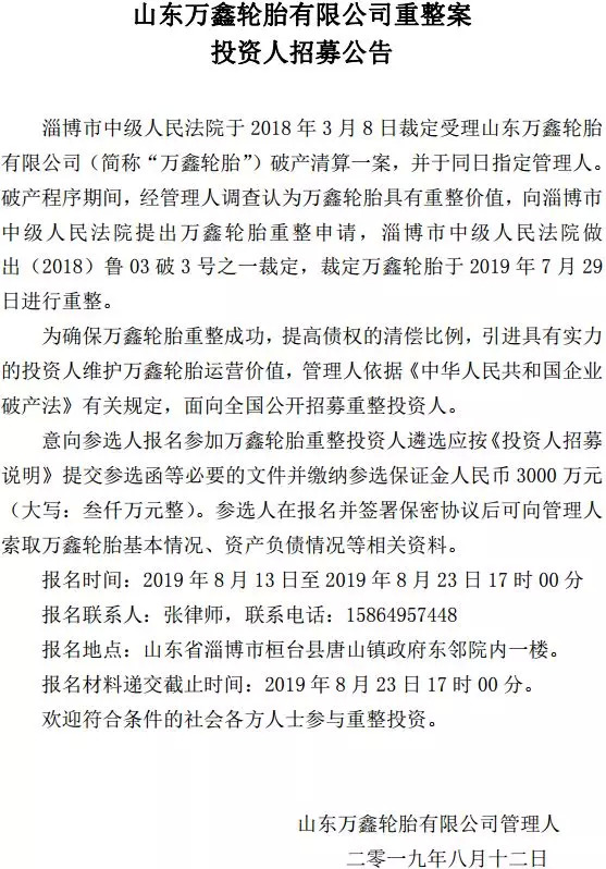 此前,淄博市中级人民法院受理了山东万鑫鹿乃有限公司破产清算案,并定于7月29日进行重整。8月12日,万鑫轮胎公司管理人正式发布投资人招募公告。