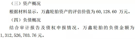“投资人招募说明”显示:万鑫轮胎资产评估价值约6亿元,负债金额约13.1亿元。属于资不抵债的情况。